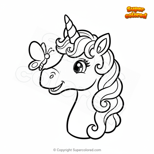 Coloring page Unicorn with butterfly on the muzzle