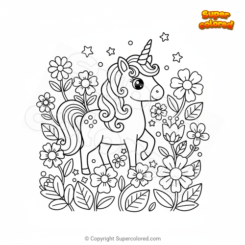 Coloring page Unicorn with flowers